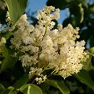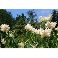 Astilbenartige, fedrige Rispen verströmen den süßen Honigduft dieser andersartigen Sorte. Damit bilden die elfenbeinweißen Blüten den Abschluss der Fliederblüte Mitte Juni. Der malerisch wachsende Strauch hat weiterhin eine leuchtend gelbe Herbstfärbung. Im Winter bietet er dekorative Samenstände.