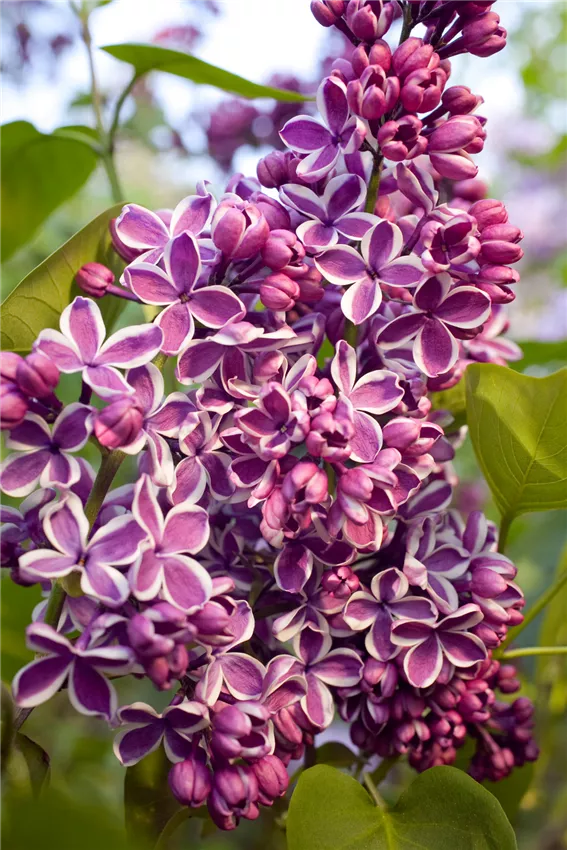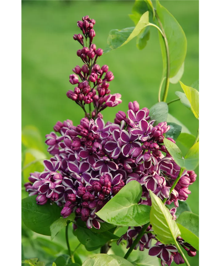 Auffällig große, dunkelpurpurviolette Rispen aus der Entfernung - erst beim näheren Hinsehen entdeckt der Betrachter die markante Zweifarbigkeit der Einzelblüten. Der weiße Blütenrand im Kontrast zum dunklen Ton im Herzen der Blüte macht diesen Flieder einzigartig.