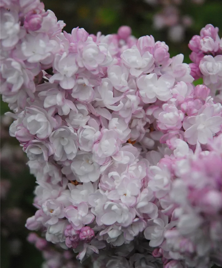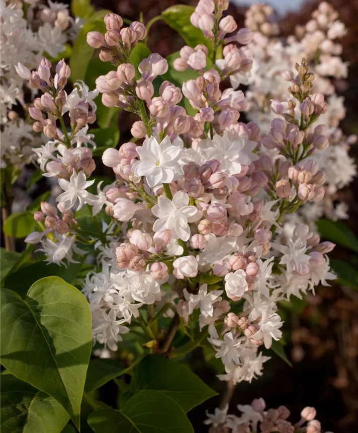 Einmalig sind die rosafarbenen Knospen, die sich in der ersten Maihälfte zu strahlend weißen und dicht gefüllten Einzelblüten öffnen. Ein Gesamtkunstwerk mit rosa überhauchten Blütenrispen, einer der größten Erfolge des russischen Fliederzüchters Kolesnikov, bereits 1947. Außerordentlich in Duft und Farbe!